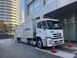 大型電源車は大型トラックベースのため、車体感覚を常に意識する必要があります。狭い市街地では決して取り回しが良いとは言えず、出発前からルートや進入経路を意識して臨みました。